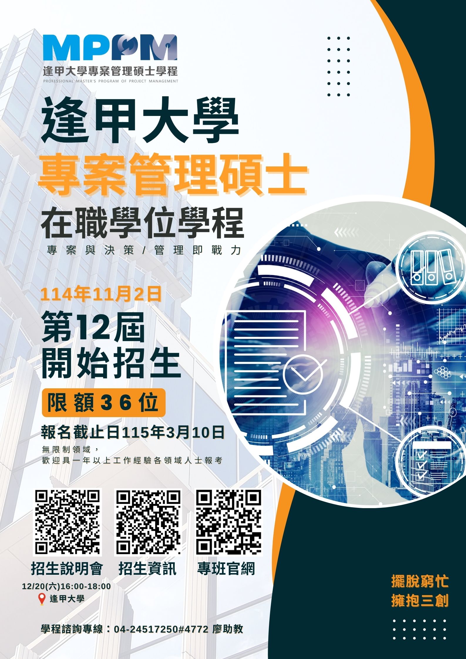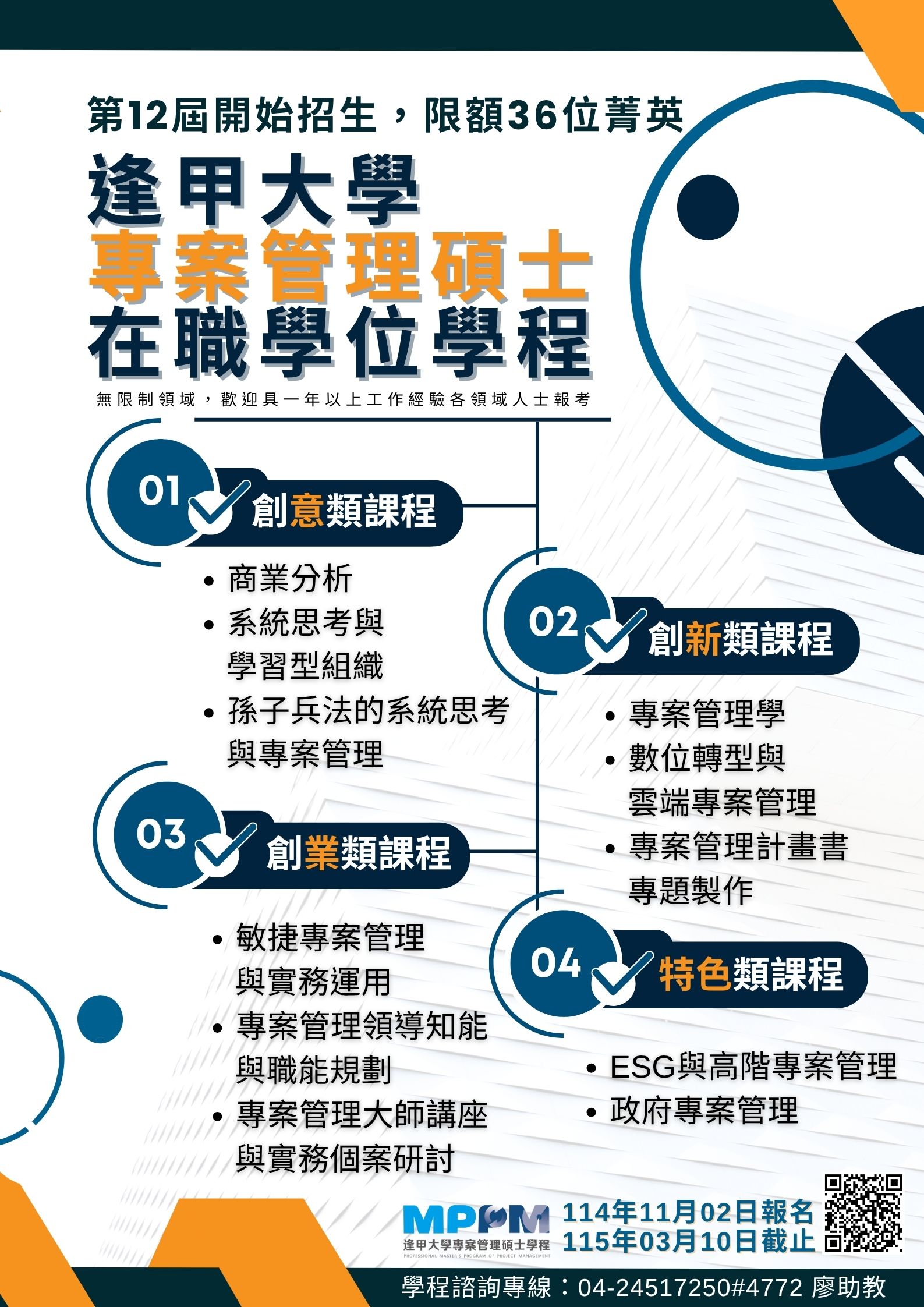 Post published:2025-11-18Post author:thvsmlc071Post category:04.研習公告 / 人事室檢送逢甲大學「專案管理碩士在職學位學程」招生資訊及「專案達標不窮忙」講座,請查照。1140010082下載1140010082_1下載1140010082_2下載 Post Views: 15Read more articles上一篇文章檢送苗栗縣教育會114年度「會員優秀子女獎學金申請辦法」,請查照。下一篇文章檢送教育部苗栗縣聯絡處114年度第6次學務創新人員甄選錄取名單,請查照。