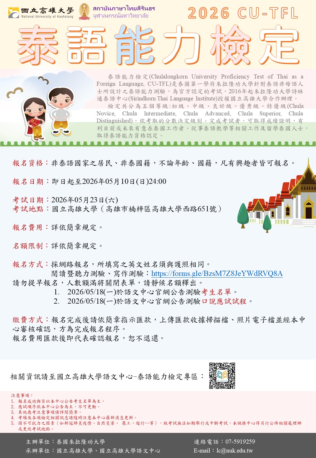 Post published:2026-03-13Post author:thvsmlc071Post category:04.研習公告 / 人事室檢送國立高雄大學與泰國朱拉隆功大學合作辦理泰語能力檢定,請查照。1150002034下載1150002034_1下載1150002034_2下載 Post Views: 25Read more articles上一篇文章崑山科技大學社會責任實踐計畫萌芽型「宜棲臺南-數位觀光導覽建置與濕地環境永續推廣」辦理2026「旅遊短影音創作競賽」徵選活動,邀請本校師生組隊參加。下一篇文章靜宜大學114學年度第2學期共開設8門磨課師課程,即日起開放線上報名,請有興趣的師生踴躍報名參加。
