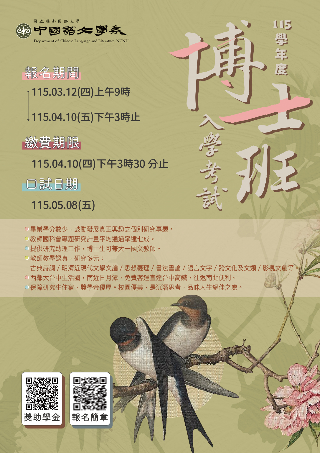Post published:2026-03-23Post author:thvsmlc071Post category:04.研習公告 / 人事室 / 教師會轉知國立暨南國際大學中國語文學系115學年度博士班入學考試開始報名, 檢送招生海報電子檔,請查照。1150002317下載1150002317_1下載 Post Views: 14Read more articles上一篇文章檢送國立臺北大學辦理「第1期葡萄牙語週六基礎班」課程,請查照。下一篇文章轉知輔仁大學學校財團法人輔仁大學管理學院「國際創業與經營管理碩士在職專班」115 學年度招生資訊如說明,請查照。