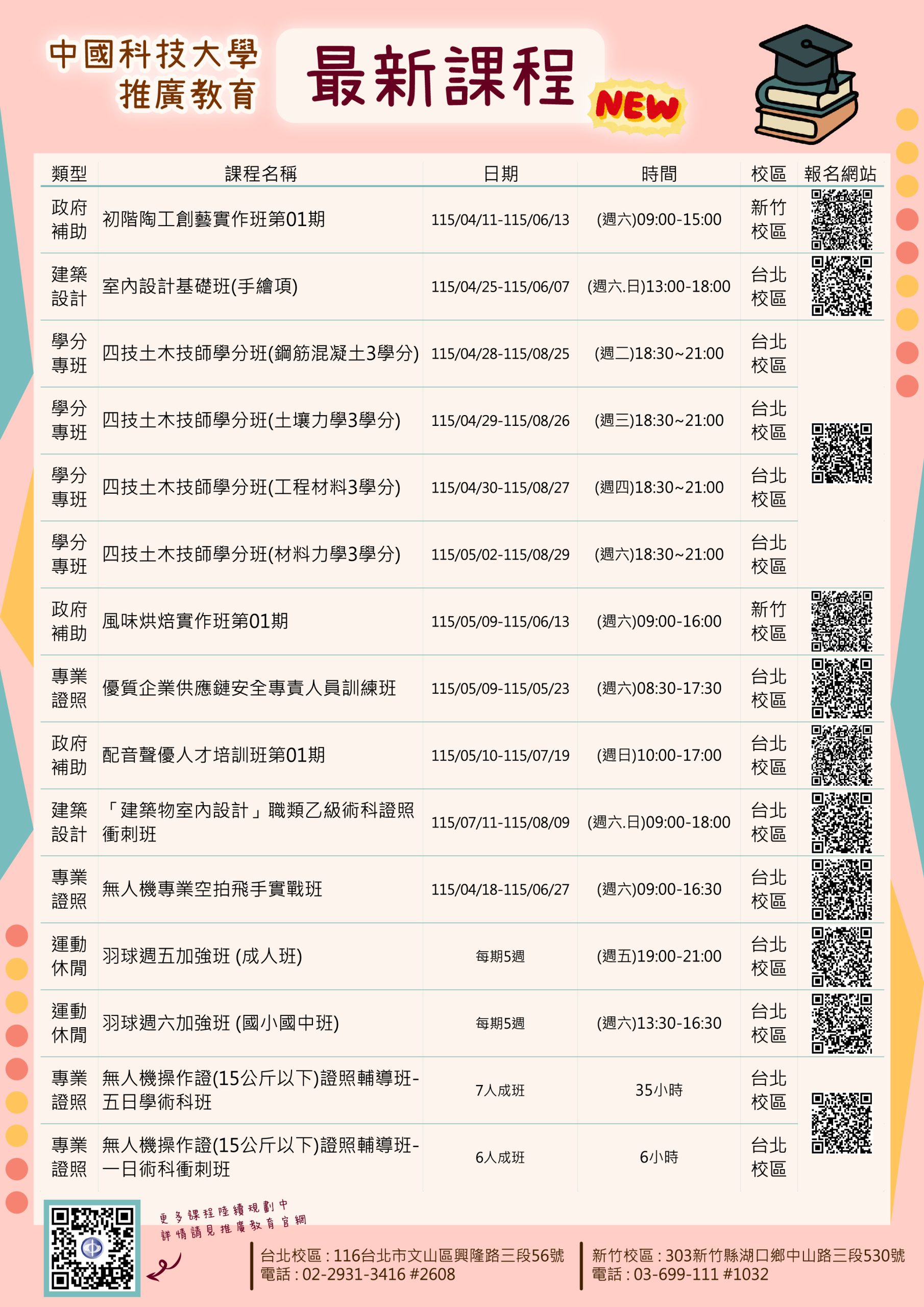 Post published:2026-03-27Post author:thvsmlc071Post category:04.研習公告 / 人事室檢送中國科技大學推廣教育中心最新課程招生資訊,請查照。1150002531下載1150002531_1下載 Post Views: 10Read more articles上一篇文章檢送國立臺北大學辦理同步遠距AI財金課程–「204期AI創新財報分析技術班」簡章暨報名表1份,請查照。下一篇文章檢送「苗栗縣115學年度高級中學校長遴選須知」1份,請查照。