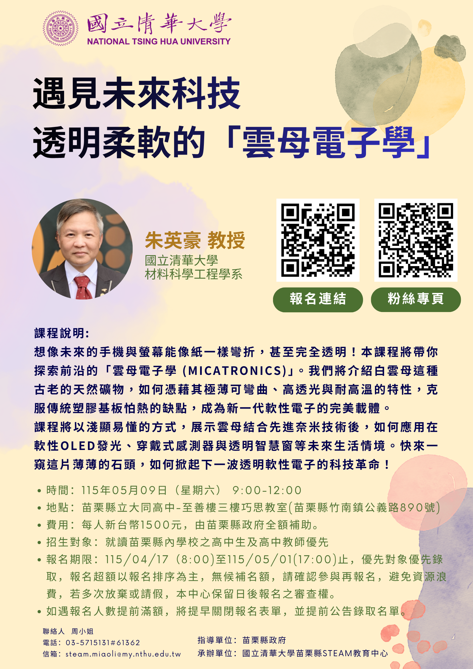一、本次課程以遇見未來科技-透明柔軟的「雲母電子學」為主題,由本校朱英豪(材料科學工程學系)教授指導。